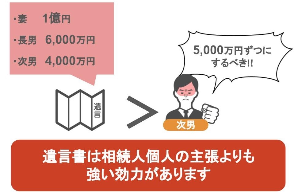 何故なら、遺言書は各相続人個人の主張よりも強い効力を持っているからです。
