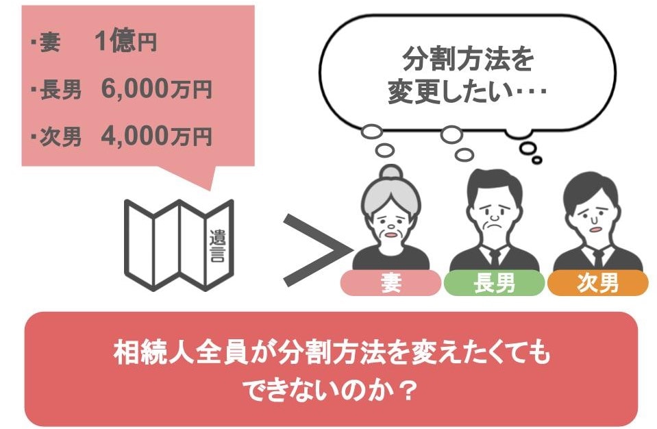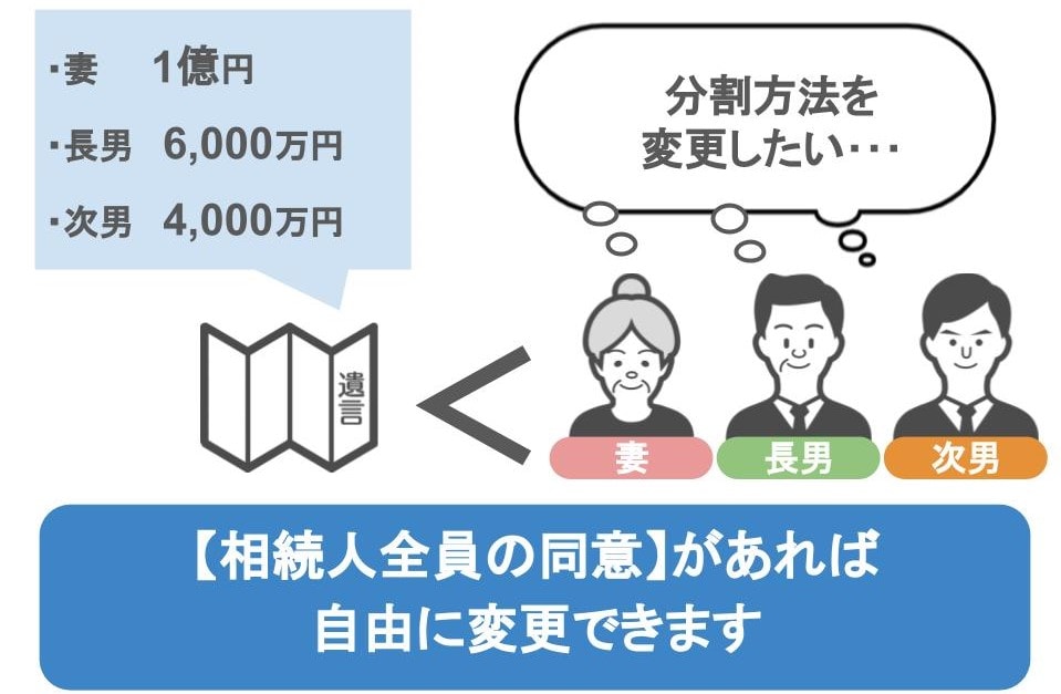 ここまでの話を聞いて、「じゃあ遺言書があったら、相続人全員が遺産の分割方法を変えたいと思っていても、遺言の内容を変えることは出来ないの?」