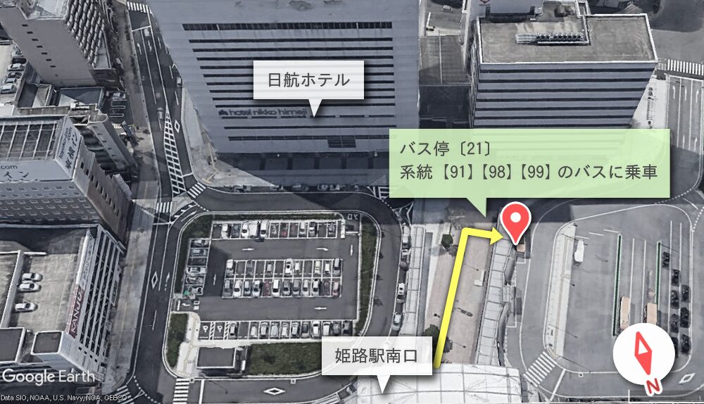 ※JR『姫路駅』をご利用の場合は、中央改札を出て左手側が南口となります。 - のりば〔21〕より、系統【91】【98】【99】のいずれかのバスに乗車