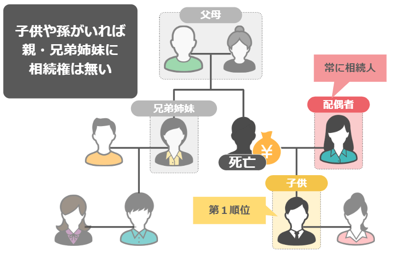 ですので子供や孫がいる場合、親や兄妹に相続権はありません。