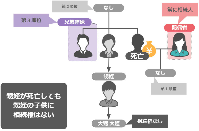 甥姪が亡くなっていれば、その子供に相続権が移るのか・・・と思われるかもしれませんが、甥姪の子供には相続権はありません。