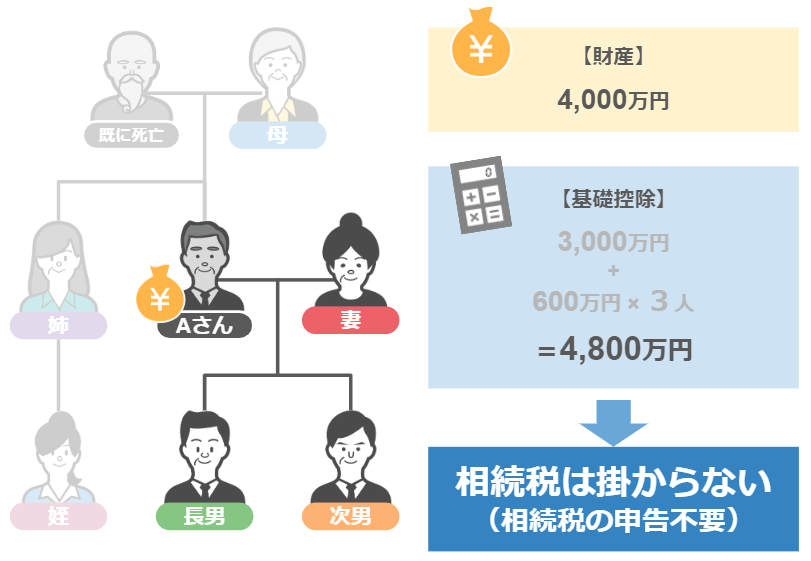 Aさんの財産は4,000万円ですから、相続税はかからず、申告も必要ありません。