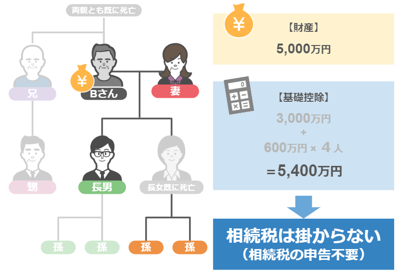 財産は5,000万円ですから、Bさんの財産にも相続税が掛かる事はありませんし、申告も必要ありません。