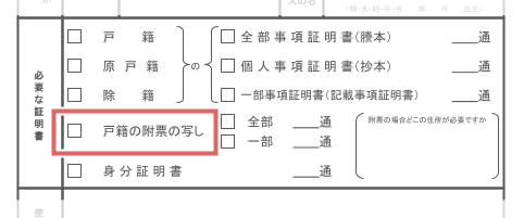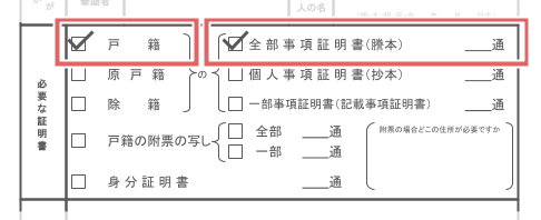 交付請求書の『必要な証明書』欄を記入する際に、『全部事項証明書(謄本)』『個人事項証明書(抄本)』のチェック欄があるので、
