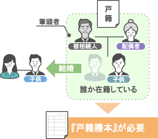 - 亡くなった方が在籍している戸籍に、配偶者や未婚の子供も在籍している場合は、
