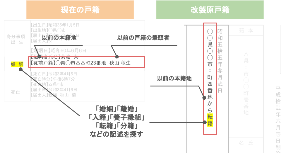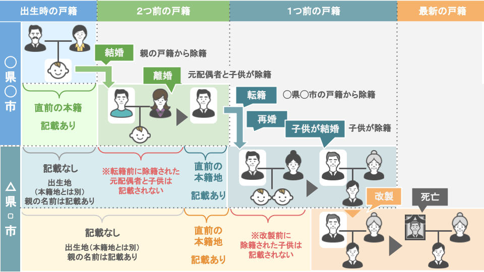 - 転籍前の情報(出生時の本籍地や兄弟姉妹、離婚した前配偶者の籍に入った子供など)は『現在の本籍地の戸籍謄本』に記載されていません。