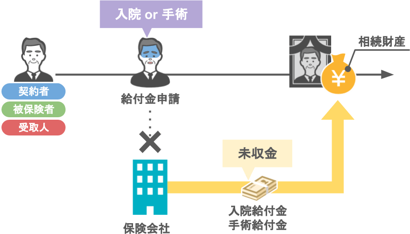 - 実際に入院や手術を受けた後に、保険会社に給付金の申請をせず亡くなると、