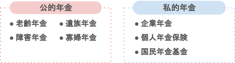 - 公的年金:老齢年金・障害年金・遺族年金・寡婦年金など