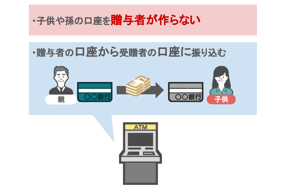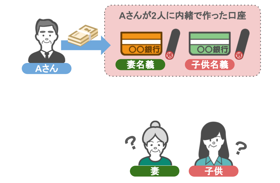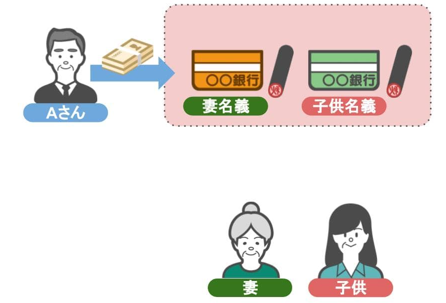 ・贈与者であるAさん本人が、妻と子供名義の預金口座を作成し、
