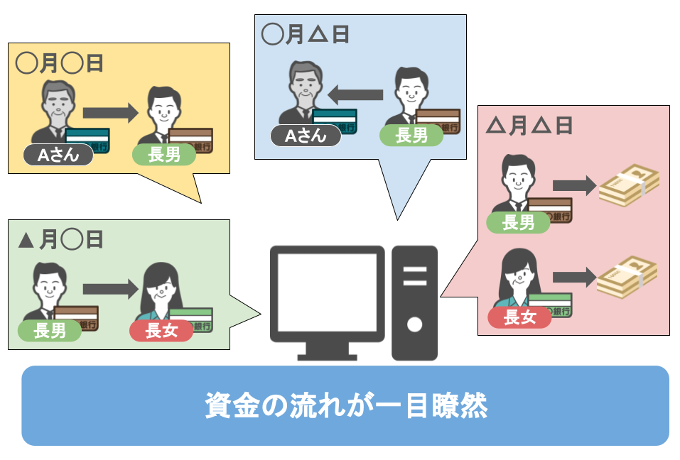 △月△日:Aさんから長男と長女に流れた資金が同じ日に現金出金されている
