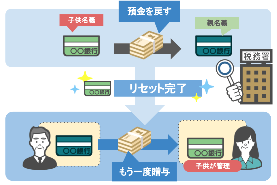 現在子供や孫名義になっている預金を、贈与者である祖父母、父母の口座に全て戻せば良いのです。