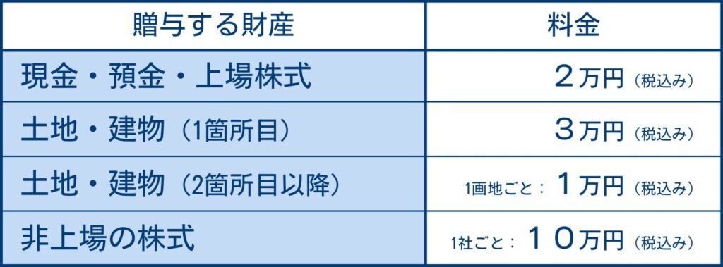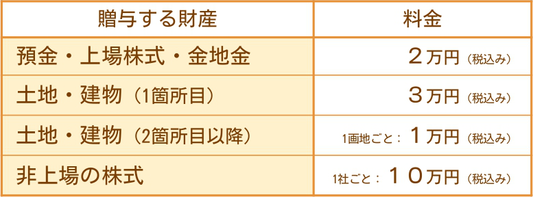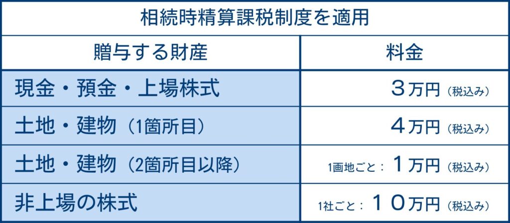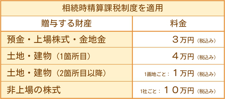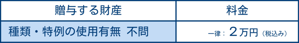 また、相続時精算課税制度などの贈与の特例を使用するか・しないかによって料金が異なりますので、下記の料金表をご確認ください。