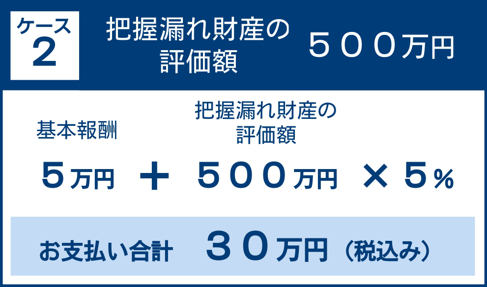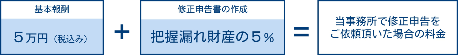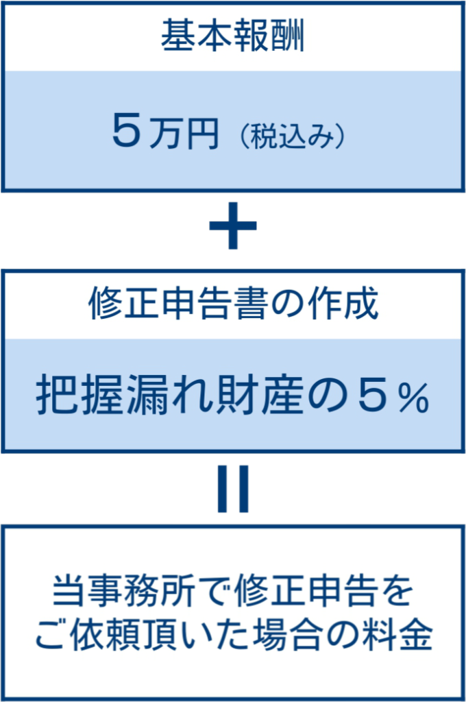 ※相続人様の把握漏れ(当事務所への資料提出漏れ)によって生じた修正申告に関しましては、計上漏れ財産額の5%を『修正申告書作成報酬』として頂戴します。