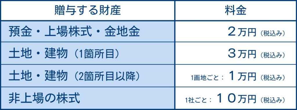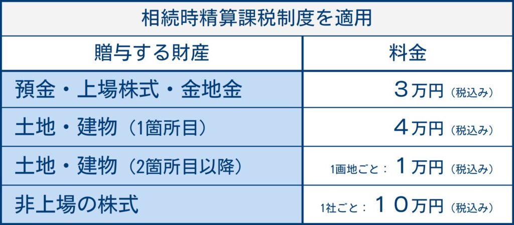 また、相続時精算課税制度などの贈与の特例を使用するか・しないかによって料金が異なりますので、下記の料金表をご確認ください。